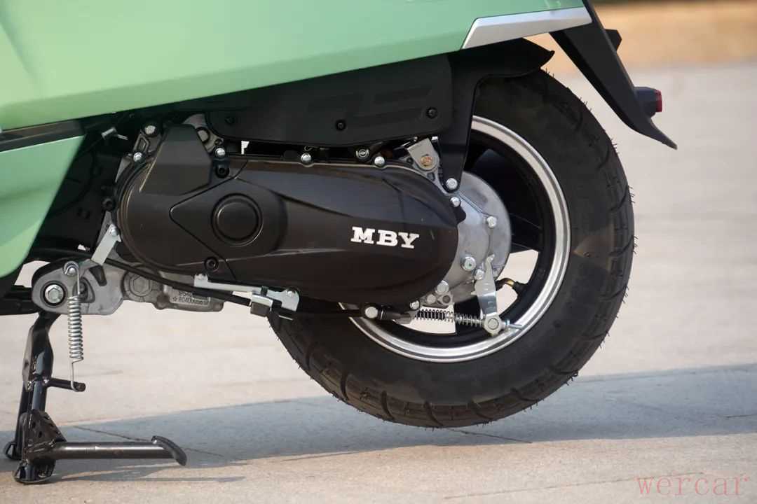 我们前面提到过,这款车的发动机来自金浪,最大功率为6.5kW,从传动箱的外形布局和螺栓孔位置可以推测出,这台发动机的参照对象来自本田的上一代125cc踏板车动力平台,也就是NS125LA上那款,当然实际出力特性和运行品质也是非常接近的。怠速时发动机震动会稍大一点点,但真正骑行时反而全段的震感都几乎可以忽略。
