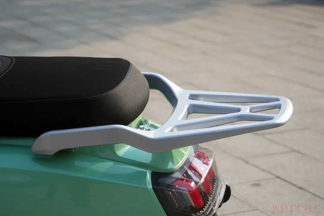 玉兔125的铝合金后货架别出心裁地降低了承载平面的高度,虽然看起来不那么运动(当然这类型的复古踏板本身也不太需要运动风格外观),但安装大容积尾箱时就不会显得突兀。
