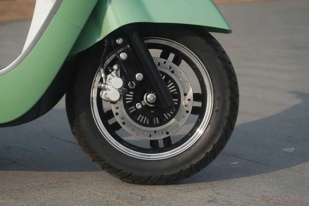 作为平价车,前碟后鼓的配置肯定不是减分项,没给前鼓刹已经算是有诚意了。规制上,玉兔125给到了一套220mm固定刹车盘+浮动式双活塞卡钳。虽然前段制动手感有些虚位,但中段开始这套刹车的制动力是足够的。外观上,前刹车盘上有齿圈,但实际上它是用于感应前轮轮速、也就是仪表上显示的时速,所以这里不能太过高兴,它并没有搭载ABS系统。