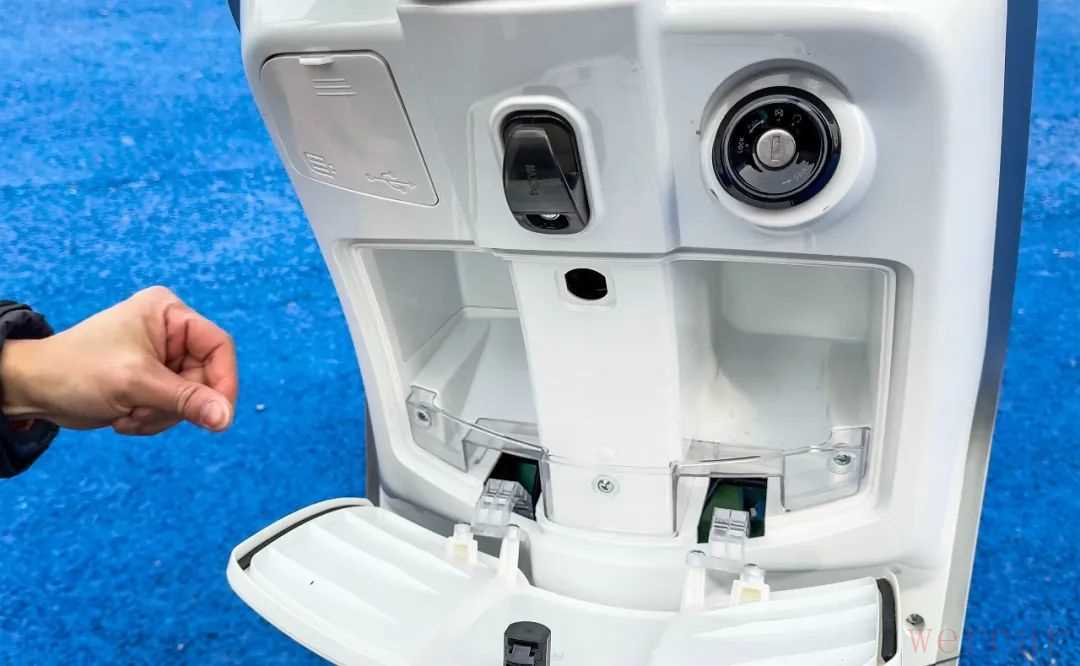 在内面板的左侧位置,玉兔125设计了一个向下翻开的小盖板(带有磁吸设计),内部是USB供电接口和一个预留给行车记录仪的空间,在高配版本上应该会被装上。