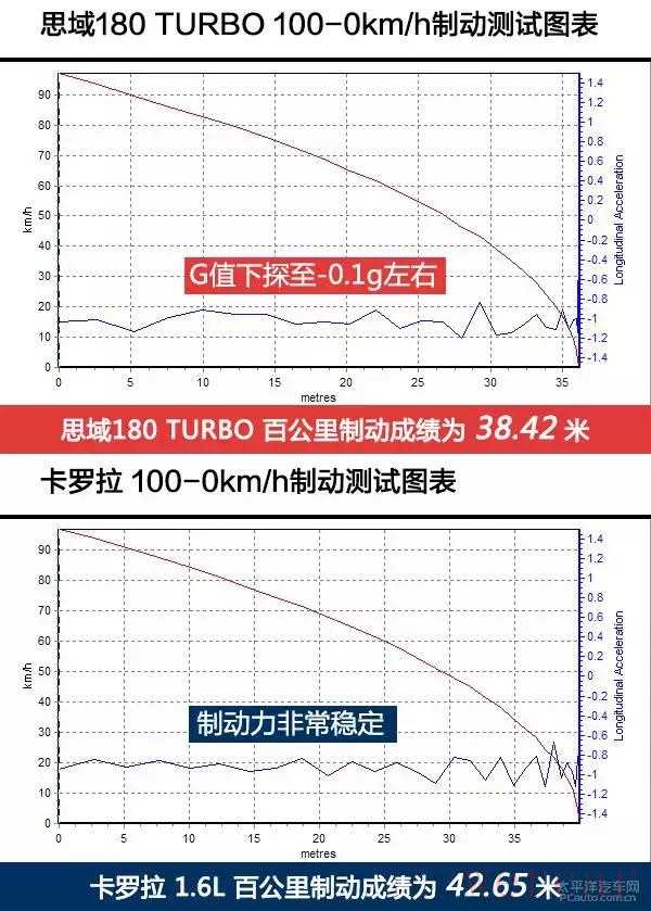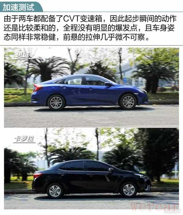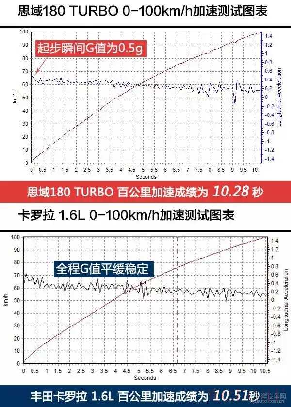 其中思域180 TURBO的起步转速为2500转,随后CVT变速箱便一直维持在高效的工作中,让发动机保持在最大扭矩的爆发区间,最终0-100km/h的加速成绩为10.28秒。而卡罗拉的起步转速为2000转,S-CVT变速箱在加速过程中模拟AT般的升挡动作,最后成绩为10.51秒。