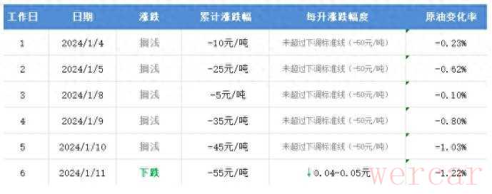 1月11日,本轮国内油价计价统计周期第6个工作日,当前参考原油变化率-1.22%,预计汽柴油下调55元/吨,折算为每升油价下跌0.04-0.05元,加满50升将节省2-2.5元!