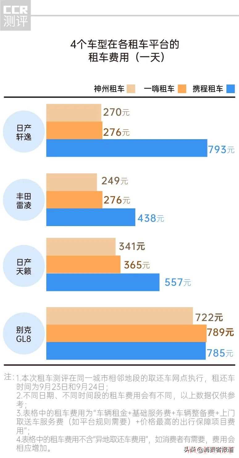 《消费者报道》在3个租车平台各挑选了4个车型进行对比,涉及车型有日产轩逸、丰田雷凌、日产天籁和别克GL8。