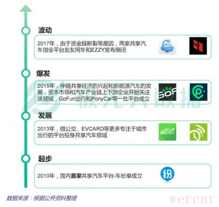 早在2010年,车纷享就开始探索共享汽车;2013年,以微公交、EVCARD为代表,更多平台进入共享出行领域;2015年以后,资本和汽车产业链纷纷布局共享汽车行业。如首汽集团推出GoFun出行,资本的涌入刺激了行业迅猛扩张,共享汽车企业一时达到上百家;2017年开始,行业发生分化,有实力的企业独占鳌头,实力不佳的企业逐步退出市场。