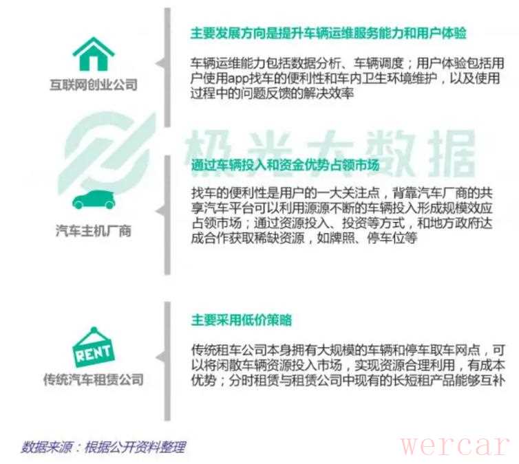 共享汽车市场背后主要有三股势力支持,包括互联网创业公司、汽车主机厂商和传统租赁公司。三类公司分别根据自身的优势采取了不同的发展策略:互联网创业公司侧重提升车辆运维和用户体验;汽车主机厂商通过源源不断的车辆投入占领市场;传统汽车租赁公司采取低价竞争策略,利用闲置的汽车资源进行运营。