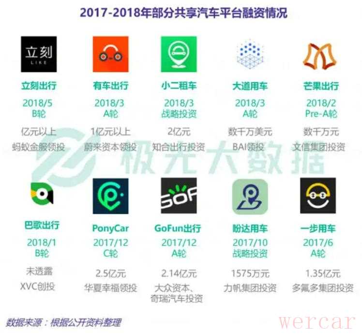 2017年3月,友友用车宣布公司解散;同年10月,EZZY宣布公司解散;2018年5月,麻瓜出行宣布停止服务;同年6月,中冠共享汽车人去楼空;同年12月,有用户向媒体曝光:途歌拖欠押金,北京总公司已空无一人,2019年1月25日,途歌遭北京市海淀区人民法院冻结名下价值24.3万元财产。