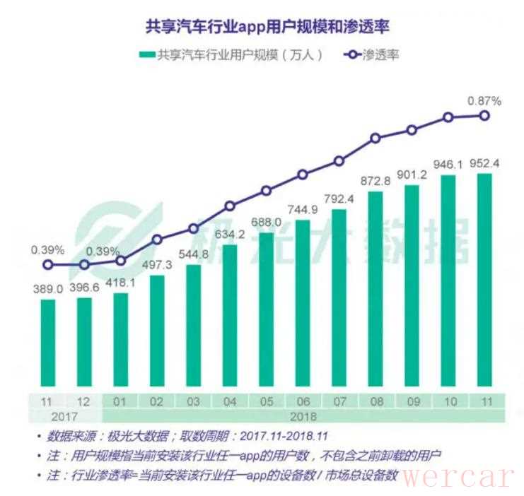 根据极光大数据的统计结果,截至2018年11月,装有共享汽车行业app的用户规模达952.4万,相较2017年同期增长达1.4倍;行业渗透率还未达到1%。2018年共享汽车行业app用户规模和渗透率均稳步增长,行业处于上升趋势。