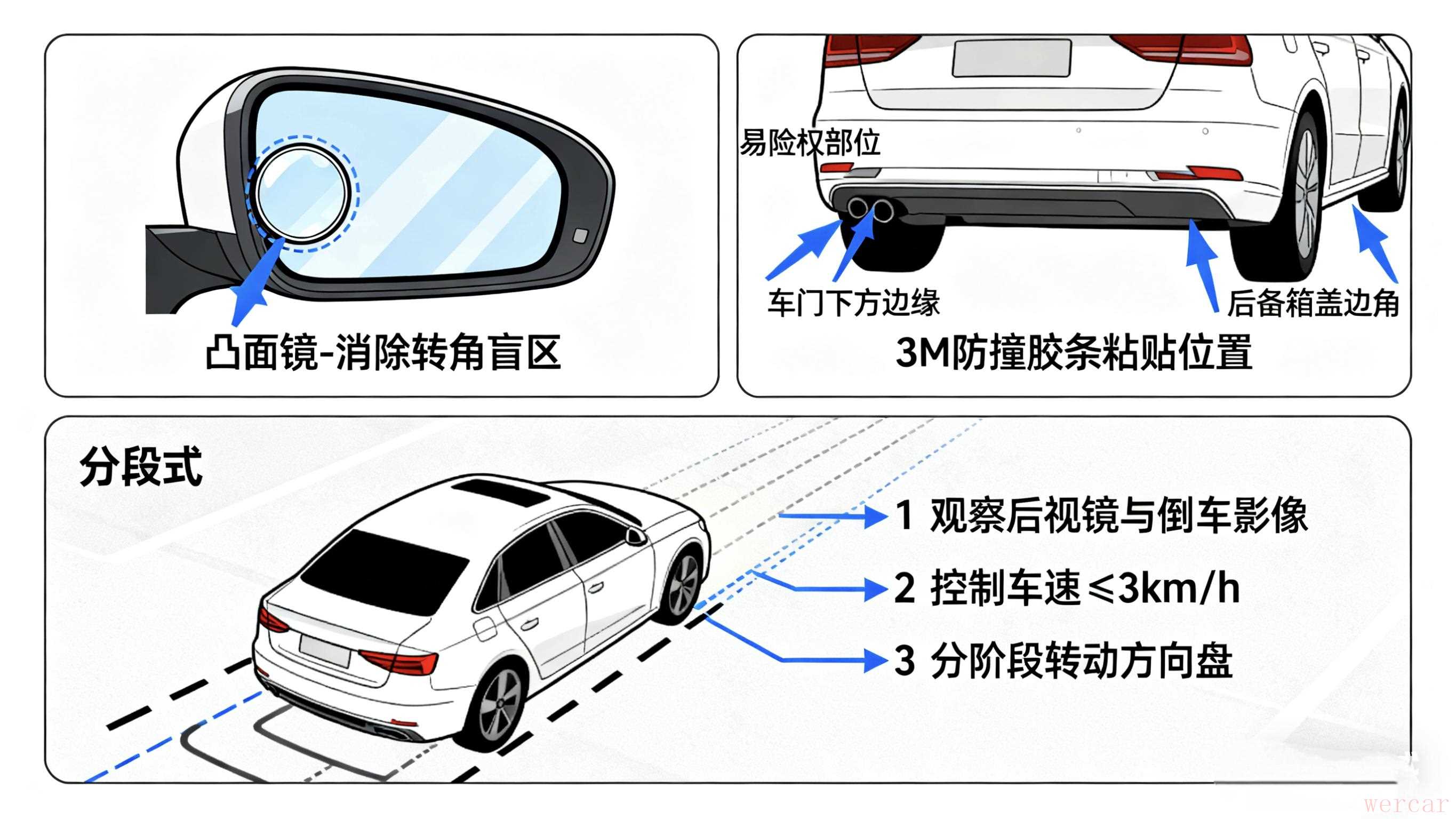3. 调整倒车习惯:将倒车速度控制在3km/h以下,并采用“分段式”倒车法