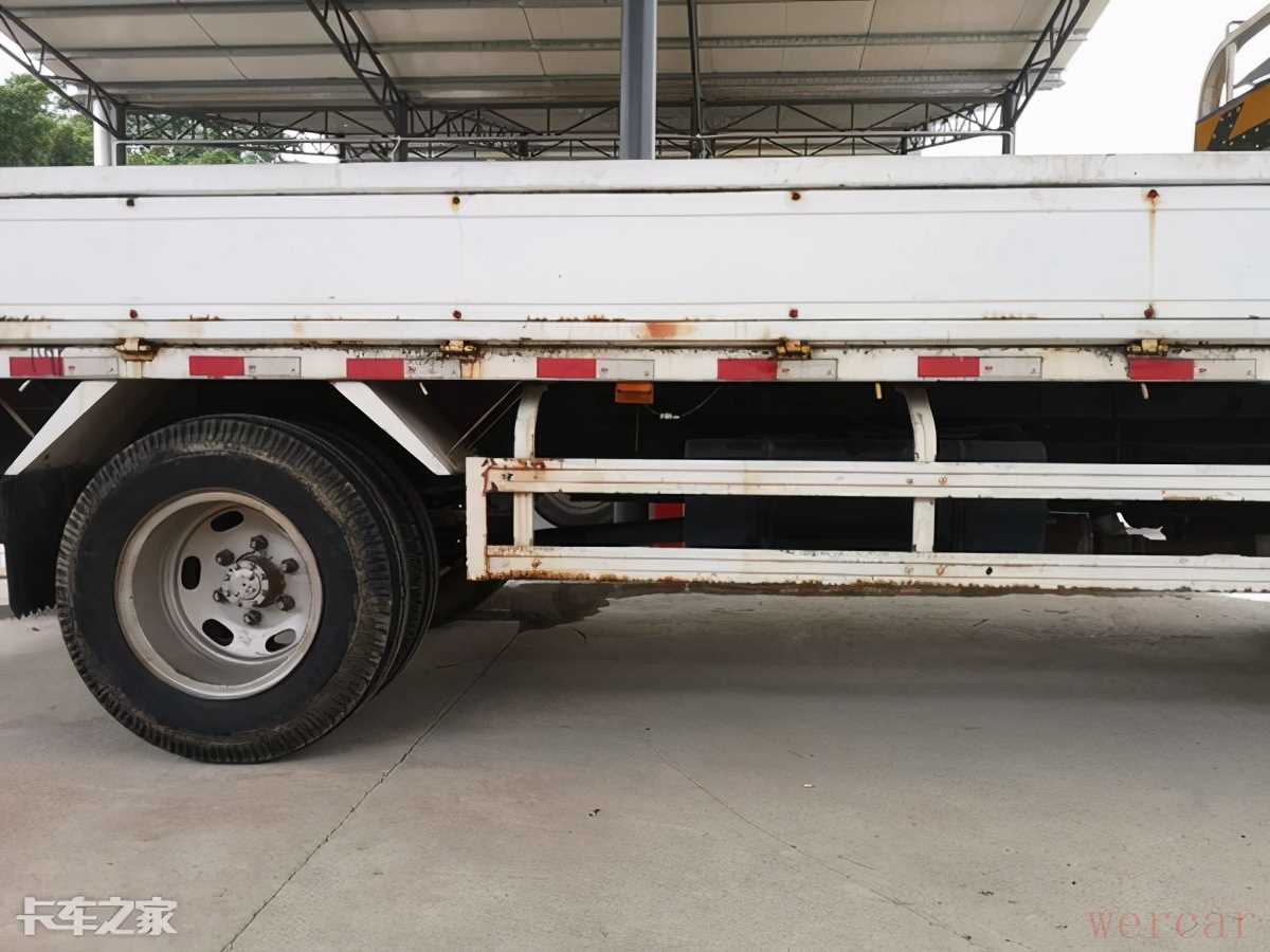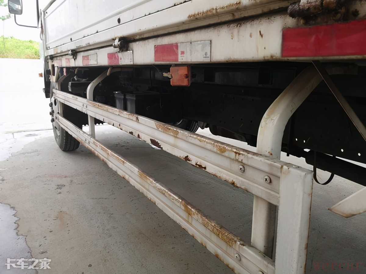 货箱的底板的木头已经烂透了,所以后面对货箱底板进行了修复,焊接了铁板固定,也便于后期装载货物,白色的货箱布满锈迹之后不是太好看,两边的侧防护栏也生锈掉色,甚至有些地方锈穿了,后面有掉落的风险。