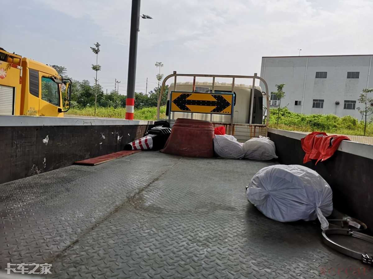五十铃原厂货箱的尾部标识感也很强,尾灯与雾灯都是原厂配置的,目前均正常使用,后护杠上贴满了反光条,提高了夜间停放时的可见度。同时后护杠也能作为蹬车的助力点来使用,在货箱的架子上还放置了太阳能警示板,在停车作业时取下开启进行现场围蔽,都是十分便捷的。