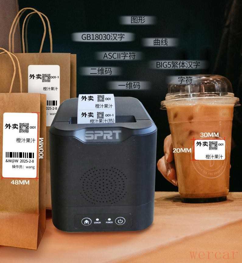 多尺寸灵活打印:支持20x30mm价签至48x100mm外卖袋标签,满足饮品规格、促销活动多样化需求;