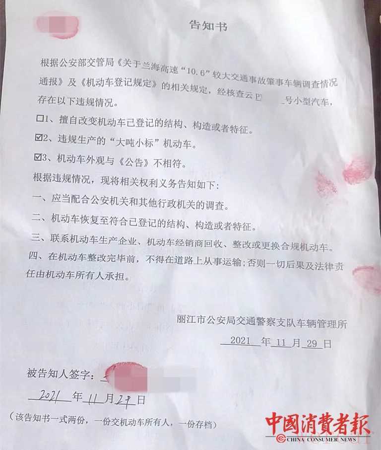 今年11月29日,陈师傅突然接到丽江市车管所通知,称其车辆存在两项违规问题:违规生产的“大吨小标”机动车、机动车外观和公告不相符。