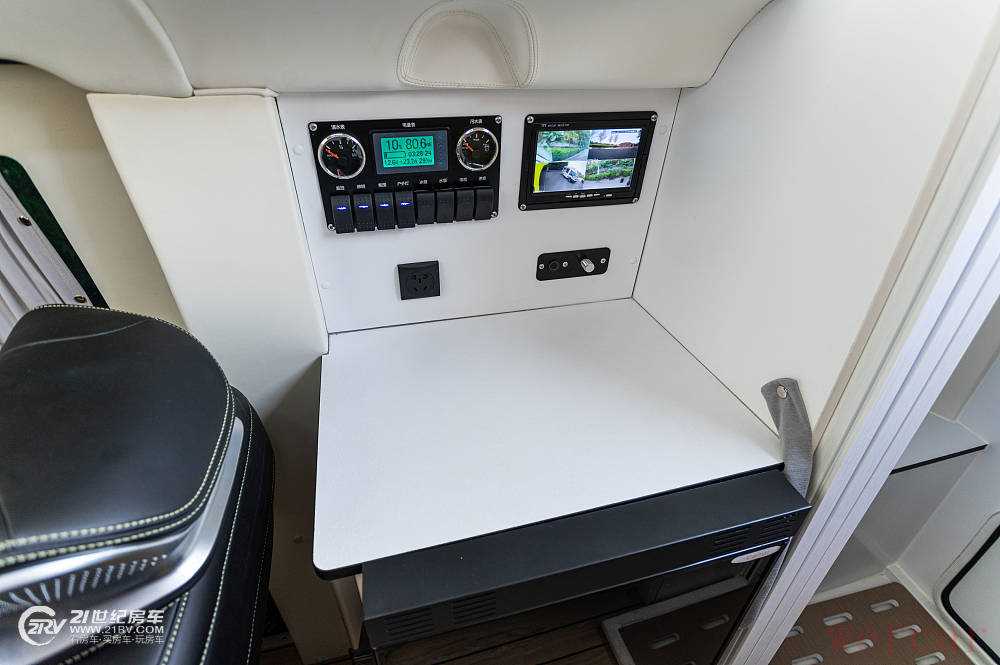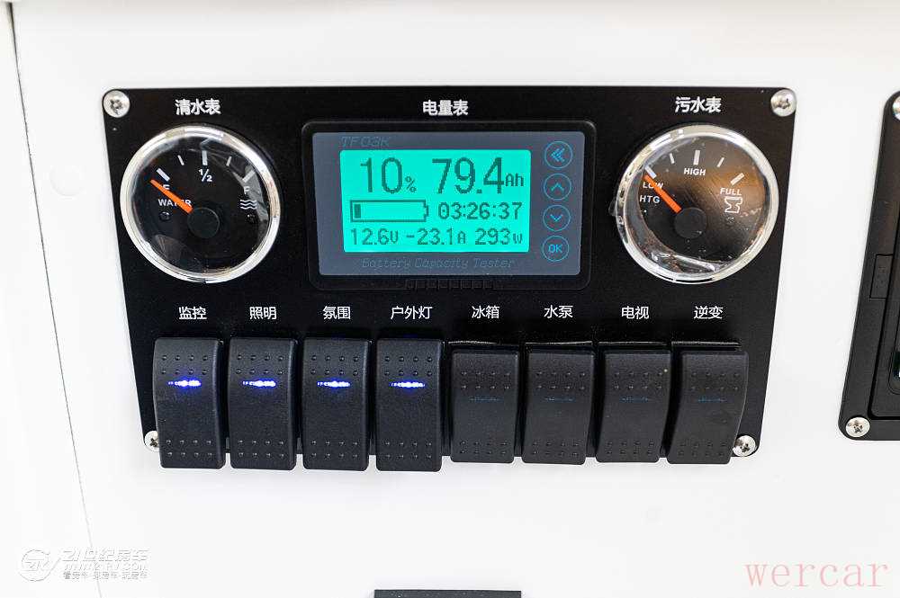 整车电路系统基于12V构建,标配了逸尘800AH锂电池、拓宝3000W逆变器、KME底制空调(K12UX-727TP)。水路方面配备150L净水箱、50L灰水箱、房车专用水泵、户外方形重力加水口(配备12V电动抽水泵)、燃油热水恒温暖风系统--德国韦巴斯特(汽油锅炉-12V/5000W,韩国东一过水热)等配置。