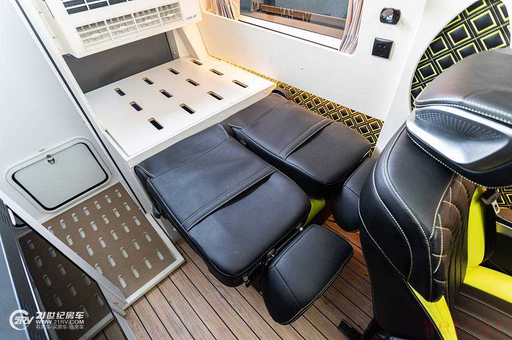 车厢内部可以提供两个休息区域。一个是车厢尾部通过座椅放倒拼接延伸的纵置床铺,拼接后的床铺大小为1850x870(mm),适合一名成年人休息,上方还配有一个KEM空调和行车暖风系统。