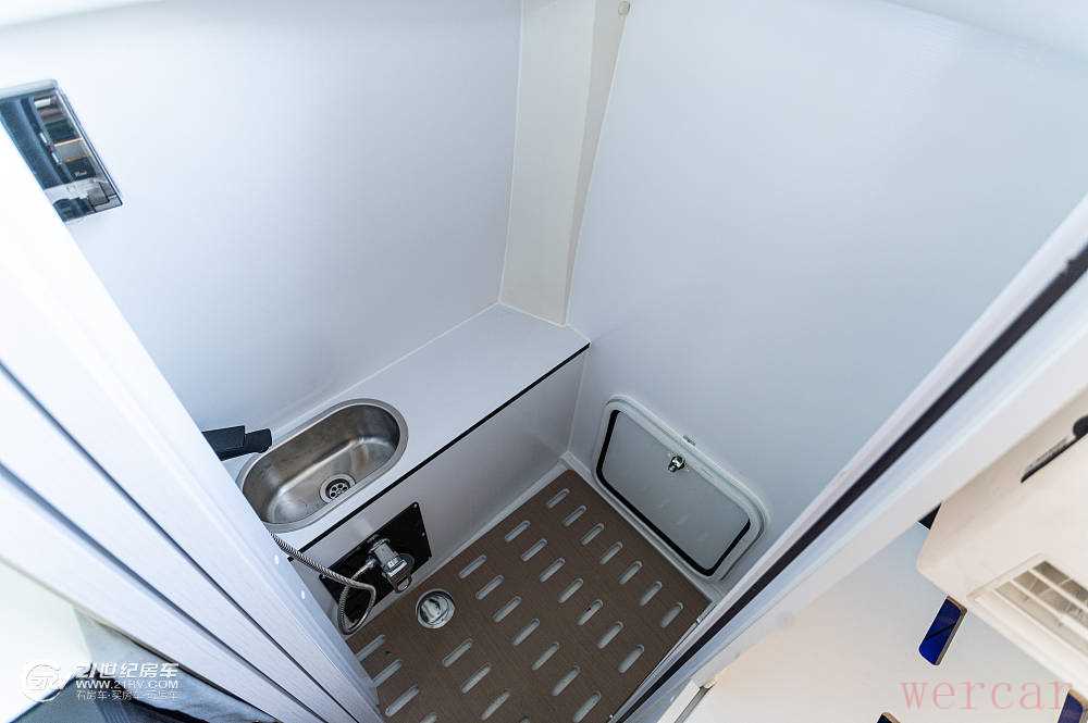 操作台后方是带软隔离的独立卫浴区,配有多美达便携式马桶、不锈钢底盆、椭圆水池、花洒、防水插座,可以满足基本的洗漱需求。