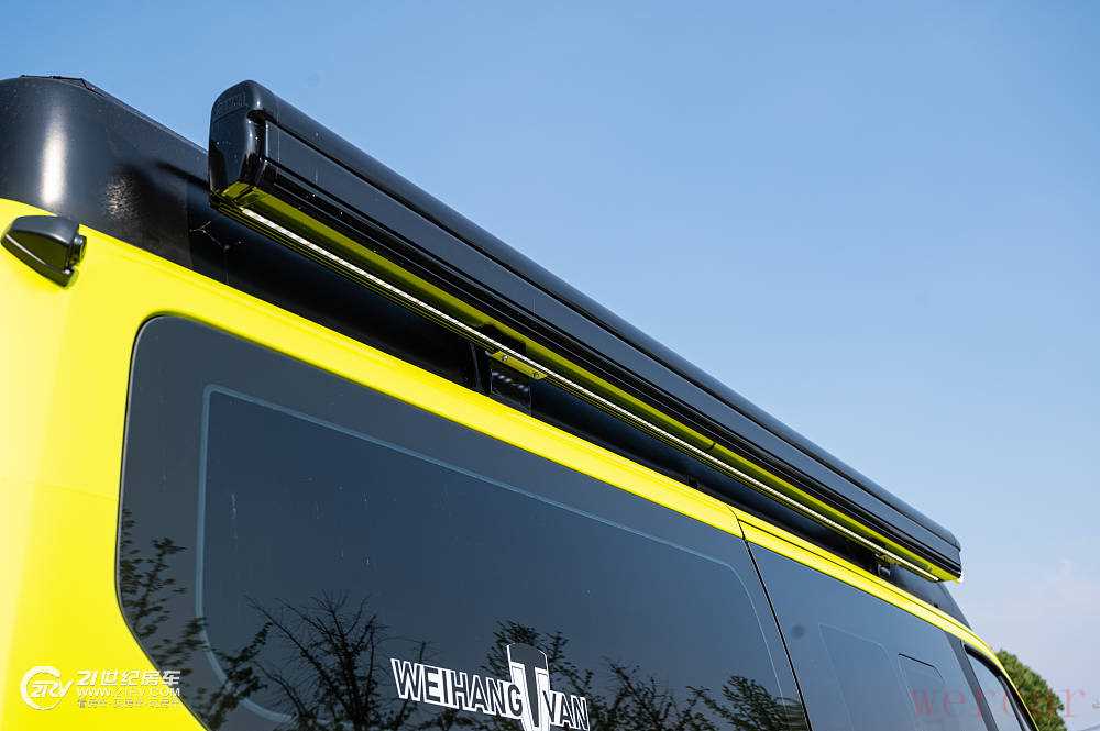 卫航穿山甲房车的外观设计思路是以年轻、时尚、个性为主导,突出了房车的活力和灵动。它采用了亮色的柠檬黄作为车身的主色调,搭配黑色的拉花和车顶行李架,形成了鲜明的对比和视觉冲击。