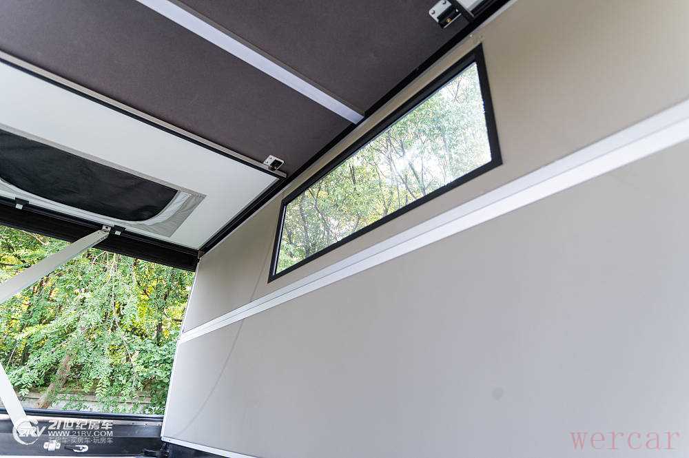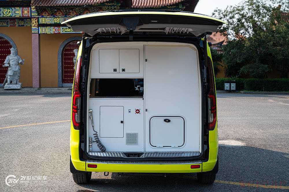 车身侧面有2.6米的户外遮阳棚,可以在户外休闲。它的车尾门可以向上掀起,内部有储物柜和淋浴花洒,方便在户外用水,还配备了220V外接新能源充电系统,优点是补能方便、灵活、成本低。