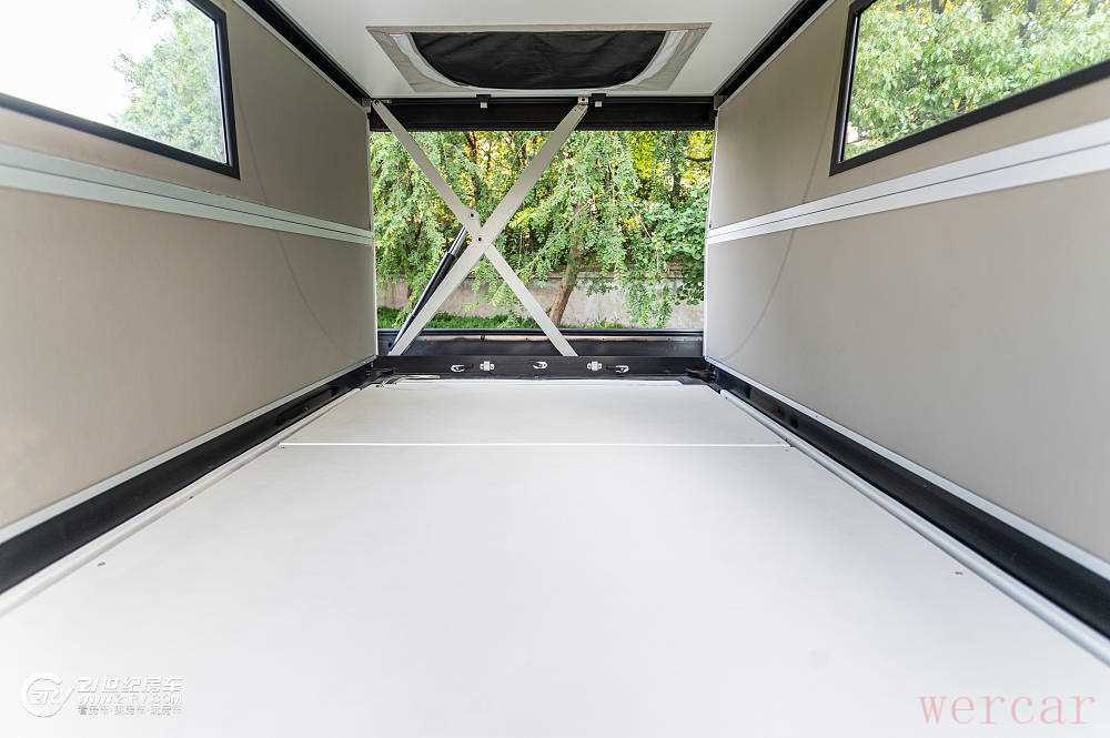 另一张床铺就是穿山甲主打的以升顶结构为特色的拓展休息区,升顶机构可通过电动遥控展开或收合,带有照明灯带和软质通风口,可以容纳两名成年人或者三名儿童。