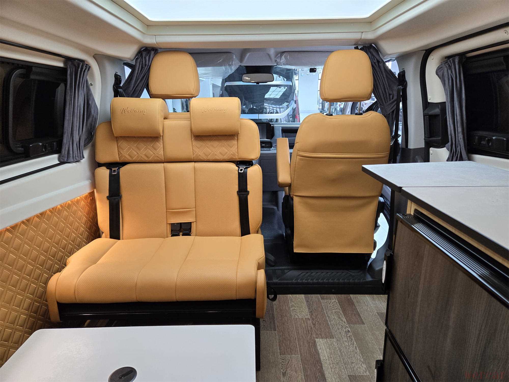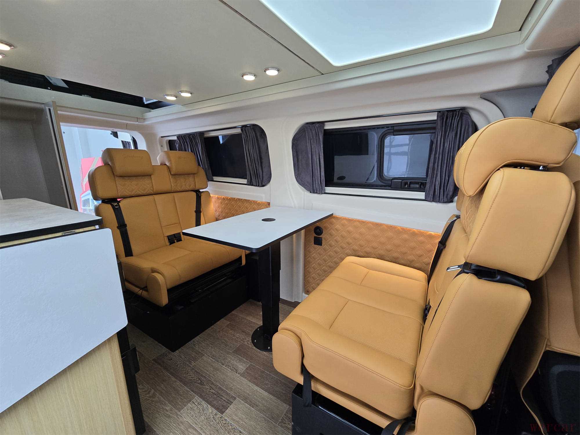 车厢前部配备两张带安全带的商务座椅,采用皮质包裹与人体工学设计,支持多向调节及腿托功能,集成座椅通风、加热、按摩模块。座椅扶手处嵌入触控屏,可一键控制座椅功能,科技感与仪式感并存。座椅前方设可折叠小桌板,表面采用防滑材质,满足办公、用餐或放置电子设备的需求。车顶布置环形LED灯带与星空顶饰,搭配浅色系环保板材,营造出温馨明亮的乘坐环境。
