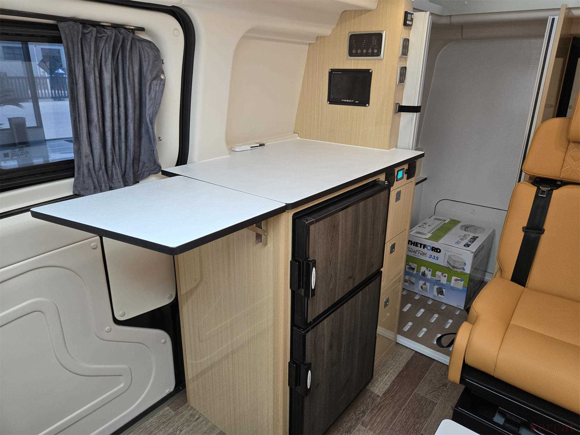 整车尺寸为5341×1986×2017mm(升顶前),升顶后高度可达3200mm,既保证了城市道路的通过性,又提升了户外停放的便利性。车尾门可完全开启,内部配备储物柜和淋浴花洒,方便户外用水;车身侧面则搭载了2.6米户外遮阳棚,为休闲活动提供更多可能。