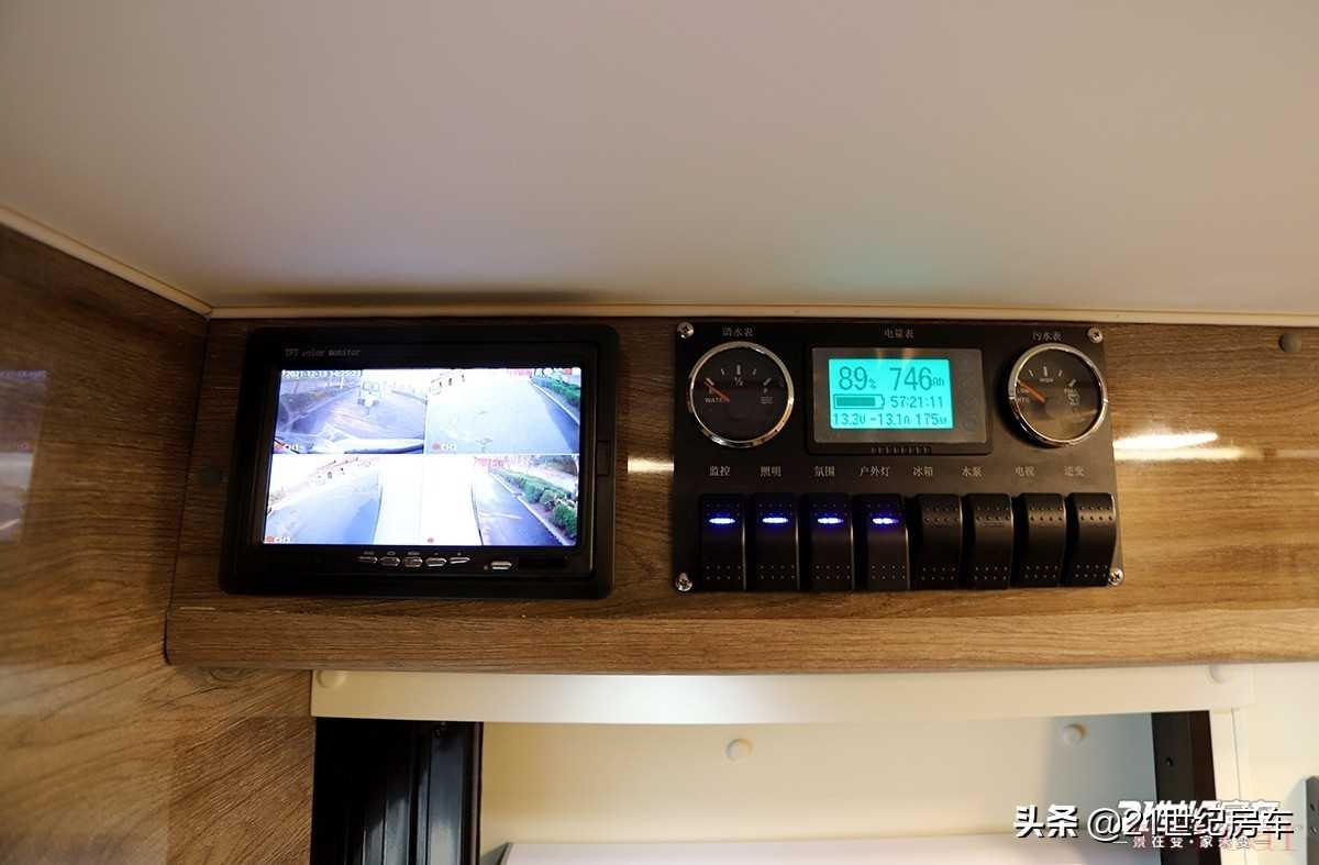 房车中门一侧,顶部配备房车水、电、灯光、设备为一体的管理控制机械面板总成和四路监控显示器以及车内厨房区。