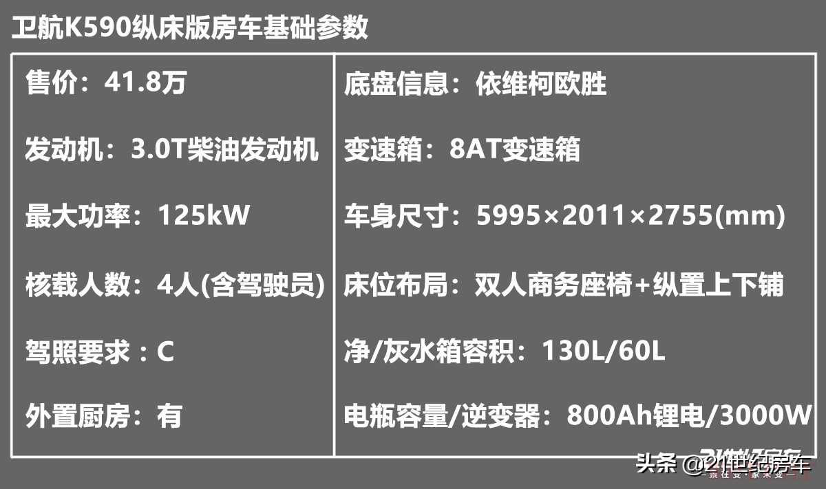 基于依维柯欧胜一类底盘打造的卫航K590房车,全车外部尺寸为5995x2011x2755(mm),底盘轴距3300mm,最大总质量4490Kg,核载4人,可持C本驾驶,上蓝牌。