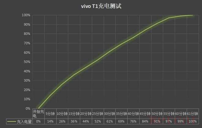 就测试数据来说,vivo T1配置的44W闪充不算很快,电量从0%充至100%需要61分钟,但配合持久的续航,体验还是不错的。电量告急时,10分钟可充入26%的电量,可以使用很长时间,30分钟充入61%的电量,足够笔者工作期间的轻度使用。
