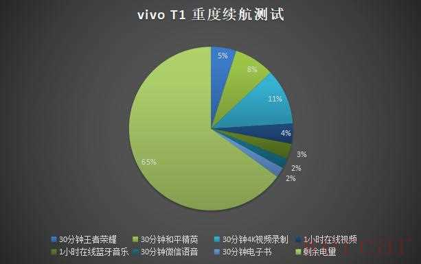 vivo T1的续航具体有多持久?笔者结合一些日常的用机场景进行了四个半小时的续航测试。测试时长已经超过了笔者工作中的用机时长,结果它内置的5000mAh大电池剩余65%的电量,其中玩30分钟王者荣耀仅耗电5%,午休时玩几把游戏,完全不需要吝啬电量。