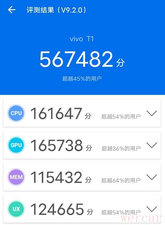 vivo T1的性能表现如何?想必这是大家比较关注的问题。首先跑个分,它的娱乐兔跑分成绩为567482分。在同价位机型中这个成绩可以位居前列。这是因为vivo T1除了骁龙778G处理器之外,还搭载LPDDR5+UFS3.1旗舰级存储配置,开篇时便提到,这是笔者选择它的主要原因。
