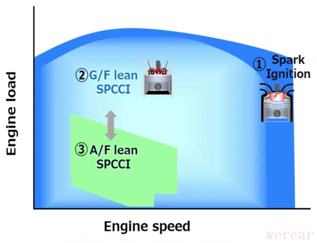马自达SKYACTIV-X能在低/中负荷下处在稀薄燃烧状态。马自达将其称为SPCCI,此时的λ大于2。