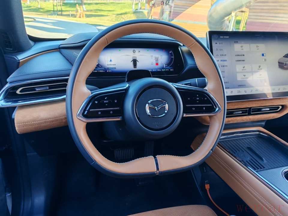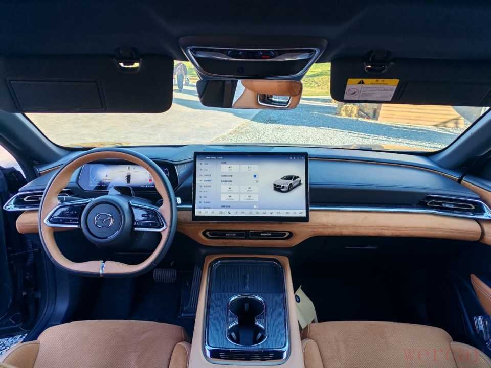 说到座舱,就来聊聊EZ-6的内饰设计。在新能源车时代,数字化、智能化的座舱比比皆是,科技感,或者说科幻感是有了,但看多了却总有一种工业糖精的廉价苍白感,少了一些设计感和质感。这也难怪,很多人吐槽说model 3的内饰简直就是毛坯房了。在这方面,马自达终于进行了突破,进入EZ-6车内,不仅能感觉到这是一台新潮的电动车,同时还能感觉到对驾驶者主体的重视,没有那种一味地堆砌各种液晶屏幕,更没有科技对于人性的压迫感,甚至还能找到一些传统燃油车上对于驾驶者,对于驾驶氛围的渲染。