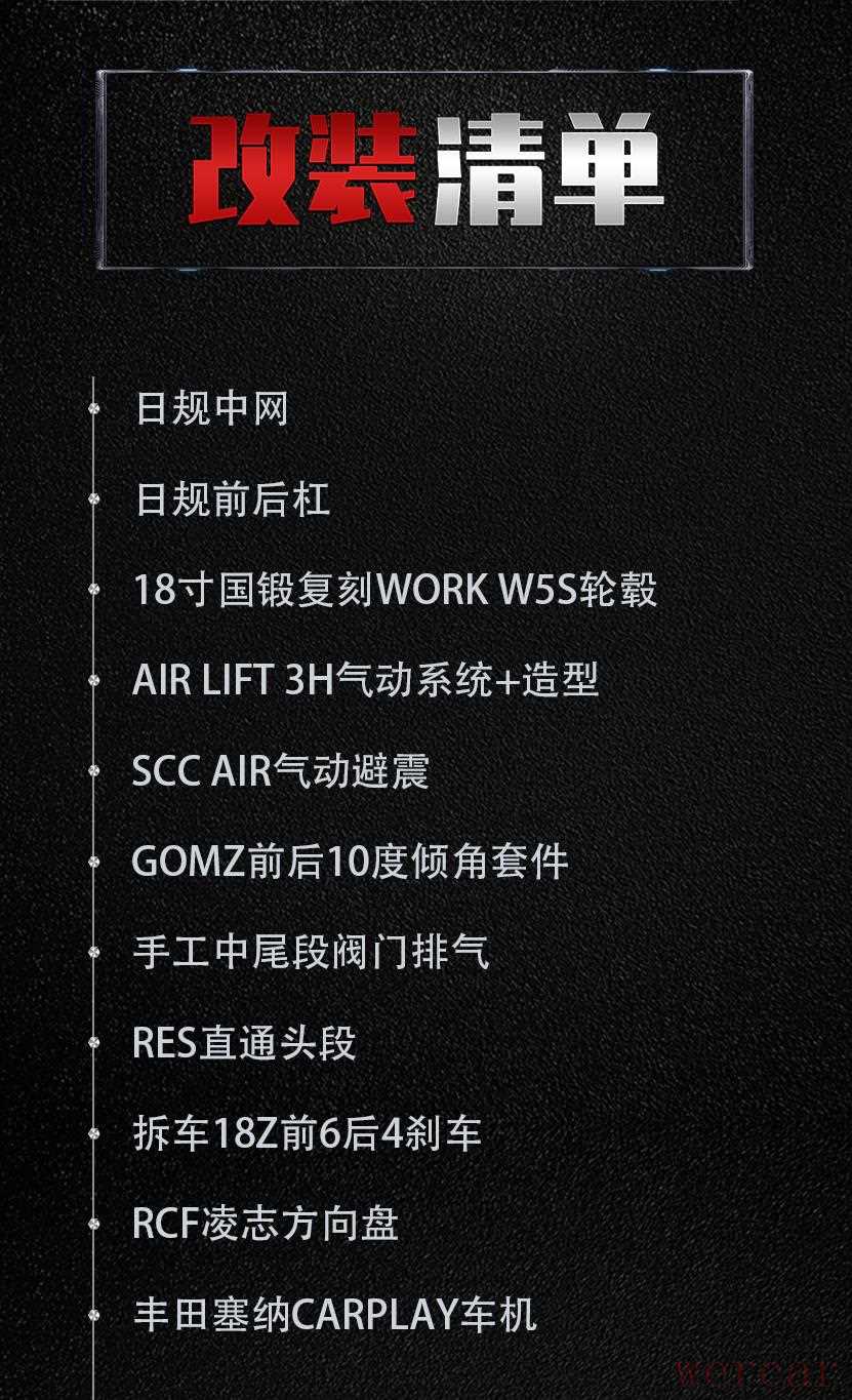 "绞牙的状态玩了一段时间后还是抵挡不住姿态风的诱惑,于是就安排了一套LEVEL AIR气动控制系统+SCC AIR气动避震上车,同时轮毂也换上了一套款式、数据都更适合的VVX五星轮毂,还diy了个seedp后杠,瞬间靓仔了不少!"