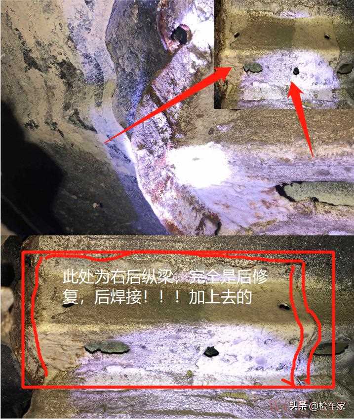 不过就在我检测右后纵梁部位时发现右后梁头已经大面积锈蚀,纵梁明显切割一段过后再进行焊接一段上去的,这如果是从正后撞进去,这速度碰撞估计3厢车直接变两箱吧。这个问题就比小了哦!!!这是车身结构件严重受损啊,不仅仅是大大影响车辆后期出售的价格,同时对驾驶安全也有一定的影响,涉及安全问题得谨慎。