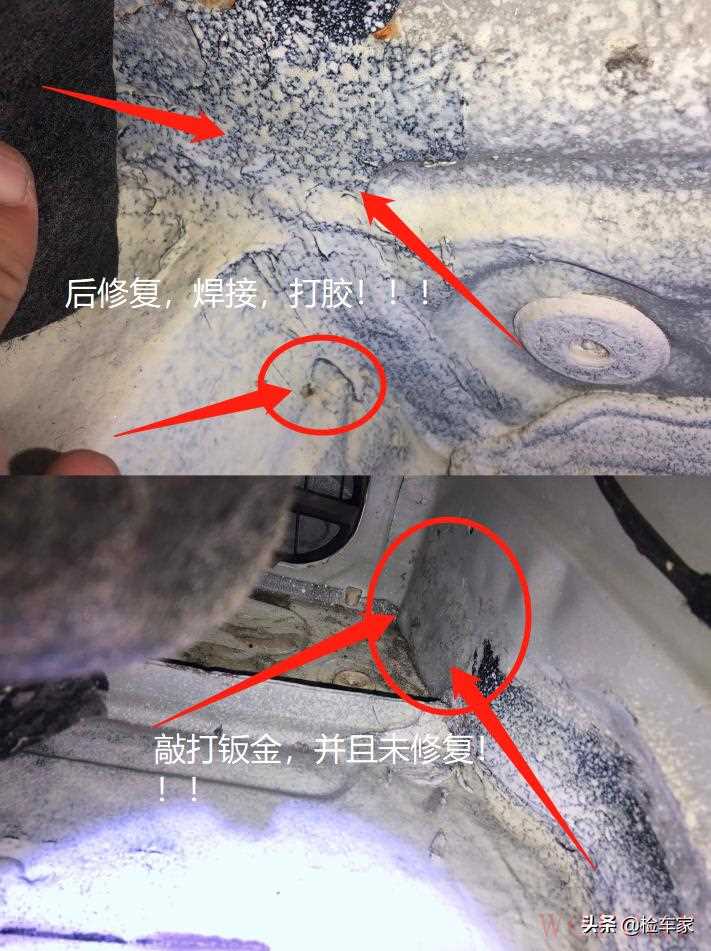 来到后备箱底部及备胎槽,图中标记位置这修复痕迹是怕人看不出来吗?!这后修复的也太差了吧?客户心太大了,估计前面看车的时候没有掀开来看,要知道这备胎槽修复了后尾板肯定也有问题的!