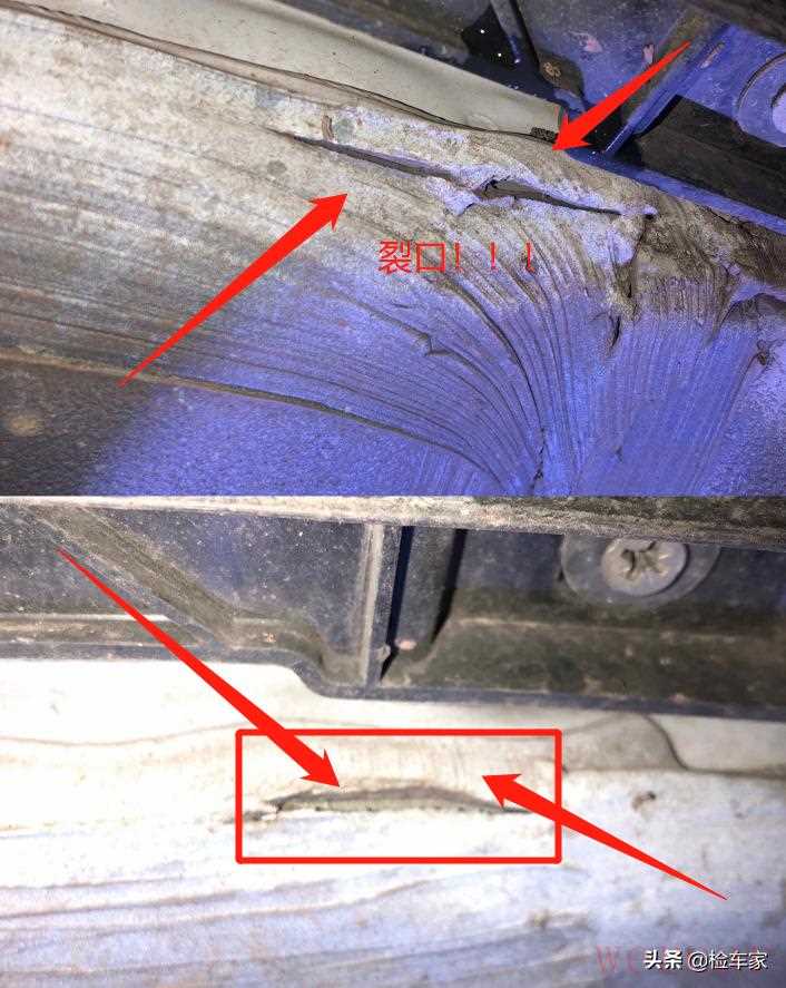 大家注意看图,此处是检测的是纵梁部位发现备胎槽底部已经开裂,当时修理不知道是没有看见还是就没处理到现在还是这样……,天宝我看着挺糟心,说实在的不管是后备箱里面的修复情况还是底盘的修复情况都很糟糕。