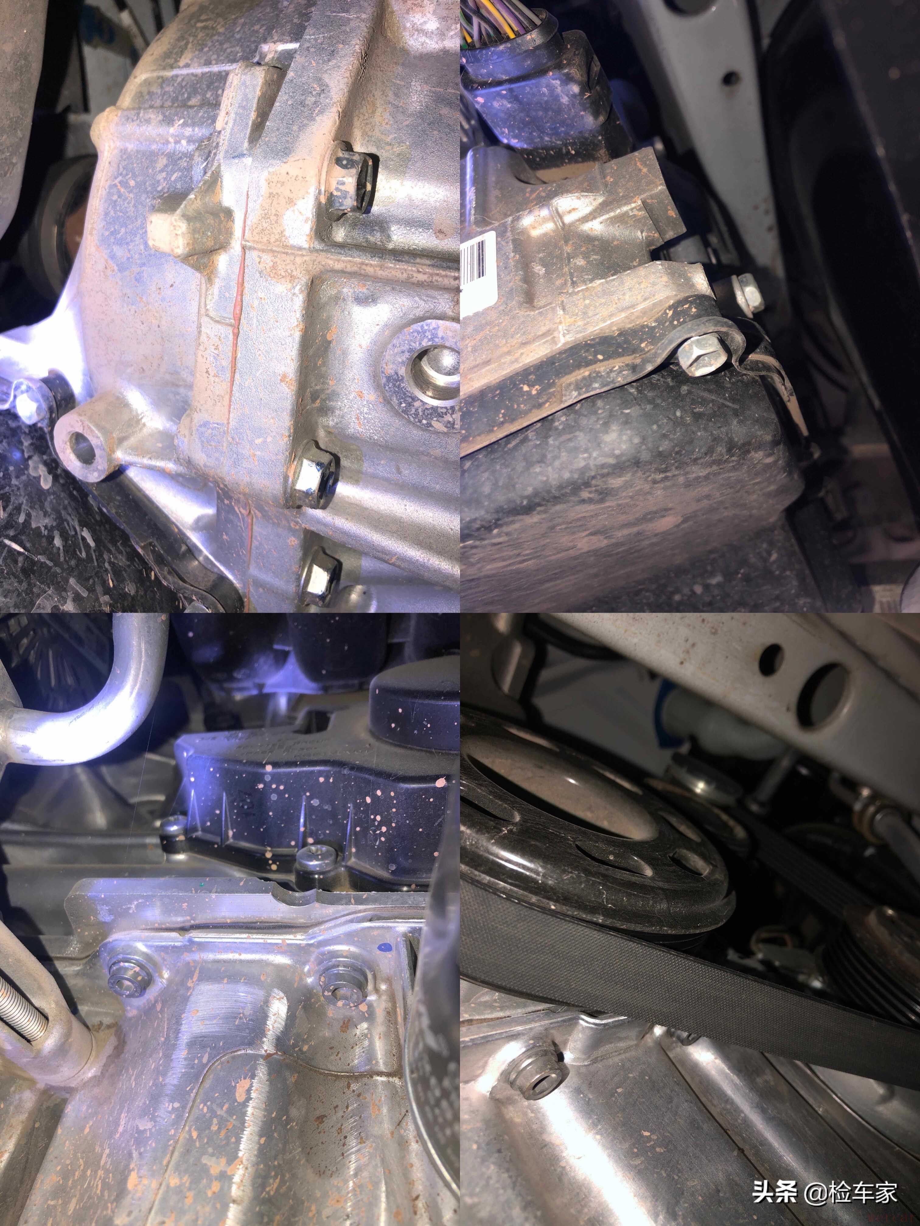 检测发动机变速箱油底壳固定螺丝及发动机曲轴前后部螺丝均无拆卸,底部无渗油漏油痕迹。