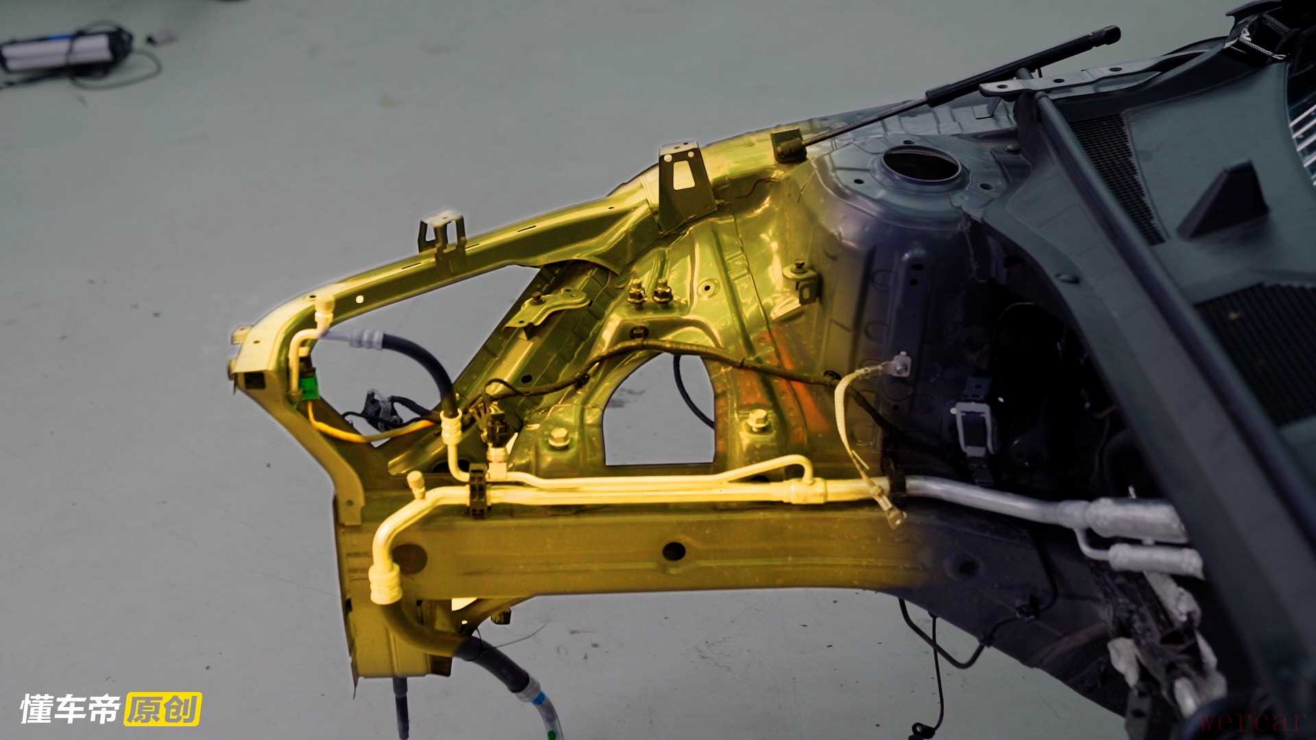 将动力总成取下之后,我们能清晰的看出,索纳塔的车头部分是有针对小重叠偏置碰撞优化的,环状结构非常明显。