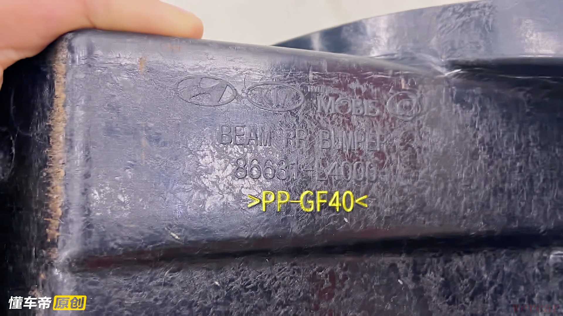 后防撞梁就比较有趣了,拆下后杠之后,我们发现索纳塔的后防撞是塑料材质的,具体材料在防撞梁上是有标注的,主要材料是PP也就是聚丙烯。