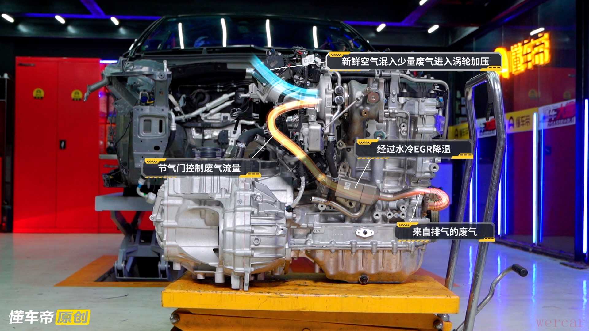 首先,我们能看到,这个大的节气门的下方是有一根管路的,这根管路是通过一个小的节气门接在EGR上的,也就是废气再循环系统。这套系统主要的作用就是从排气侧引入一部分燃烧过后的废气,经过EGR水冷降温之后,重新吸入气缸,从而降低进气的氧气浓度,配合喷油系统,降低发动机做功时的温度,进而降低氮氧化物的排放。这个小的节气门就是用来控制从EGR流出的废气的量,大的节气门负责控制内部的负压,也能间接控制流入进气系统的废气的比例。