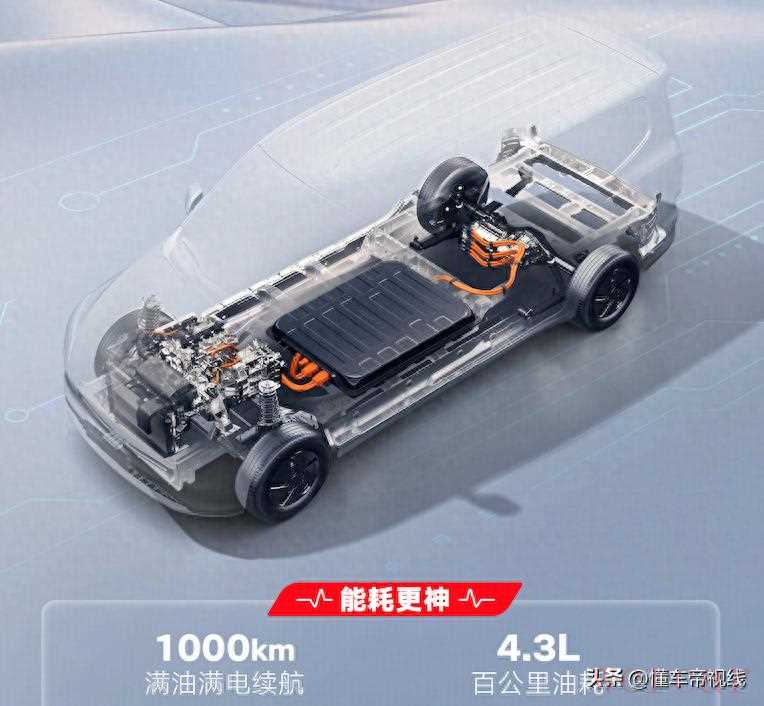 2.  "高能效表现:" 百公里油耗4.3升是一个非常低的水平,即使对于增程系统来说也相当出色。这表明该增程系统在能量转换效率、辅助动力系统优化等方面有不错的表现,有助于降低使用成本,并提升产品的市场竞争力。
