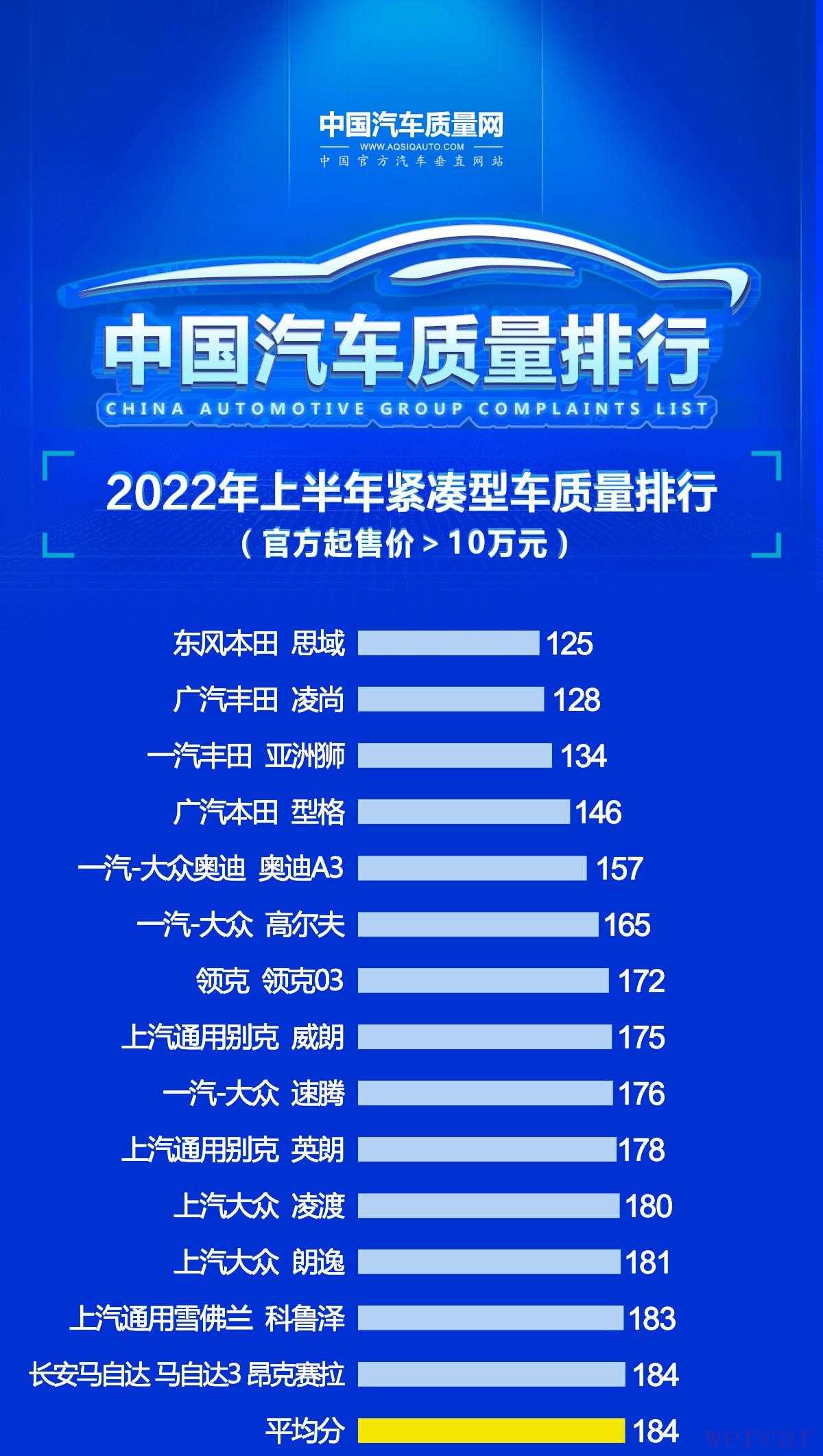 导读: 根据乘联会发布的轿车销量数据分析来看,紧凑型车依然是消费者最喜欢的车型,它们的价格定位都不高,空间以及动力表现也能满足家用,而像轩逸、思域、英朗、速腾、宝来、朗逸、威朗、凌渡以及科鲁泽等畅销车型,都属于紧凑型车范畴。不过大家在买紧凑型车时也要慎重,根据“中国汽车质量网”最新公布的新车质量榜单来看,仅有14款紧凑型车质量表现及格,合资车再次霸占了榜单,思域、型格、高尔夫、威朗以及速腾等车型,都有着比较出色的质量表现,别克英朗排名第十,大众朗逸也是榜上有名。不过像轩逸、宝来、凌派和福睿斯等车型均未能入榜,而卡罗拉、雷凌、福克斯和标致408等车型,质量表现也都不及格(质量分处于平均值之下)。买紧凑型车要慎重!质量榜公布,仅14款及格,英朗第十,朗逸上榜!