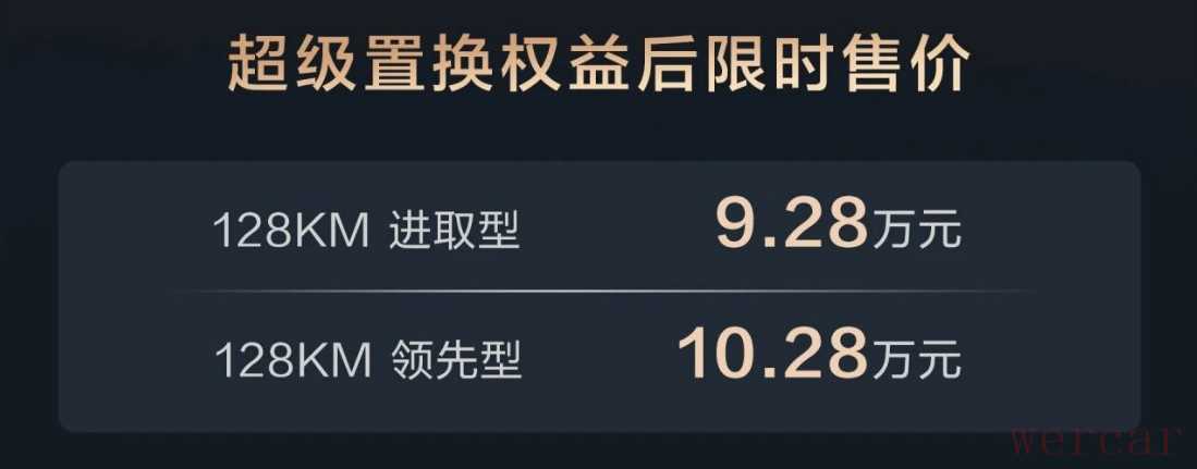 限时权益价,9.28万至10.28万。全系都是128KM的长续航,外观变动不大,增加了一个未央灰的新配色。内饰主要把电子挡改换成了怀挡,其他地方变动不大。
