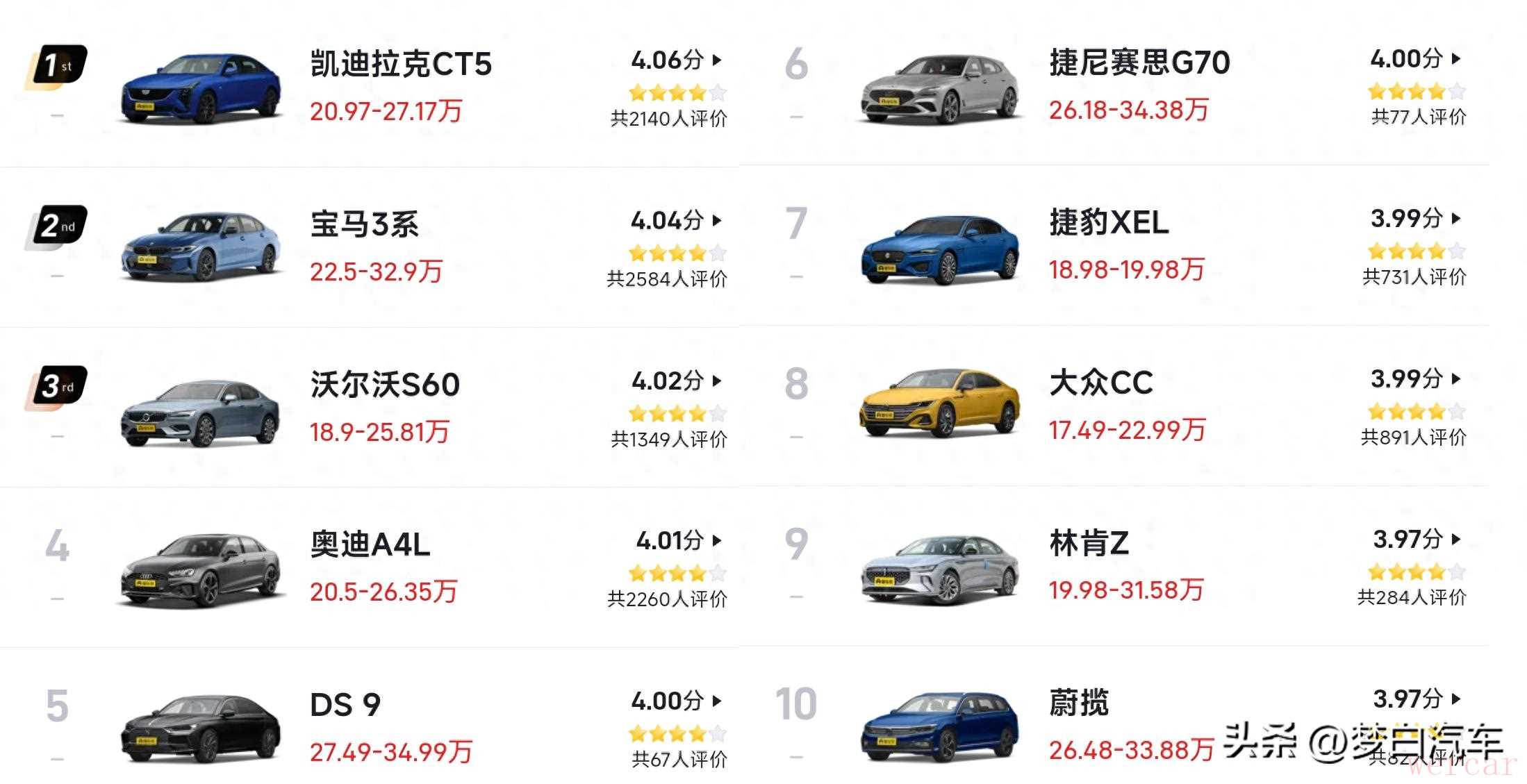 口碑评分达到4分以上的B级车共有6款,且均为中高端车型,不过令人没想到的是,夺得B级车口碑评分第一名的居然是凯迪拉克CT5,有超过2000人参与了评分,可参考性还是比较高的。宝马3系夺得亚军,口碑评分达到了4.04分,沃尔沃S60、奥迪A4L、DS 9和捷尼赛思G70也都是达到了4分以上,奥迪A4L排名第四位,也是比较令人认可的。此外,大众CC、捷豹XEL、林肯Z和蔚揽也都是入榜前十,它们也都是主打品质的B级车,虽然销量表现一般,但消费者的认可度还是蛮高的。
