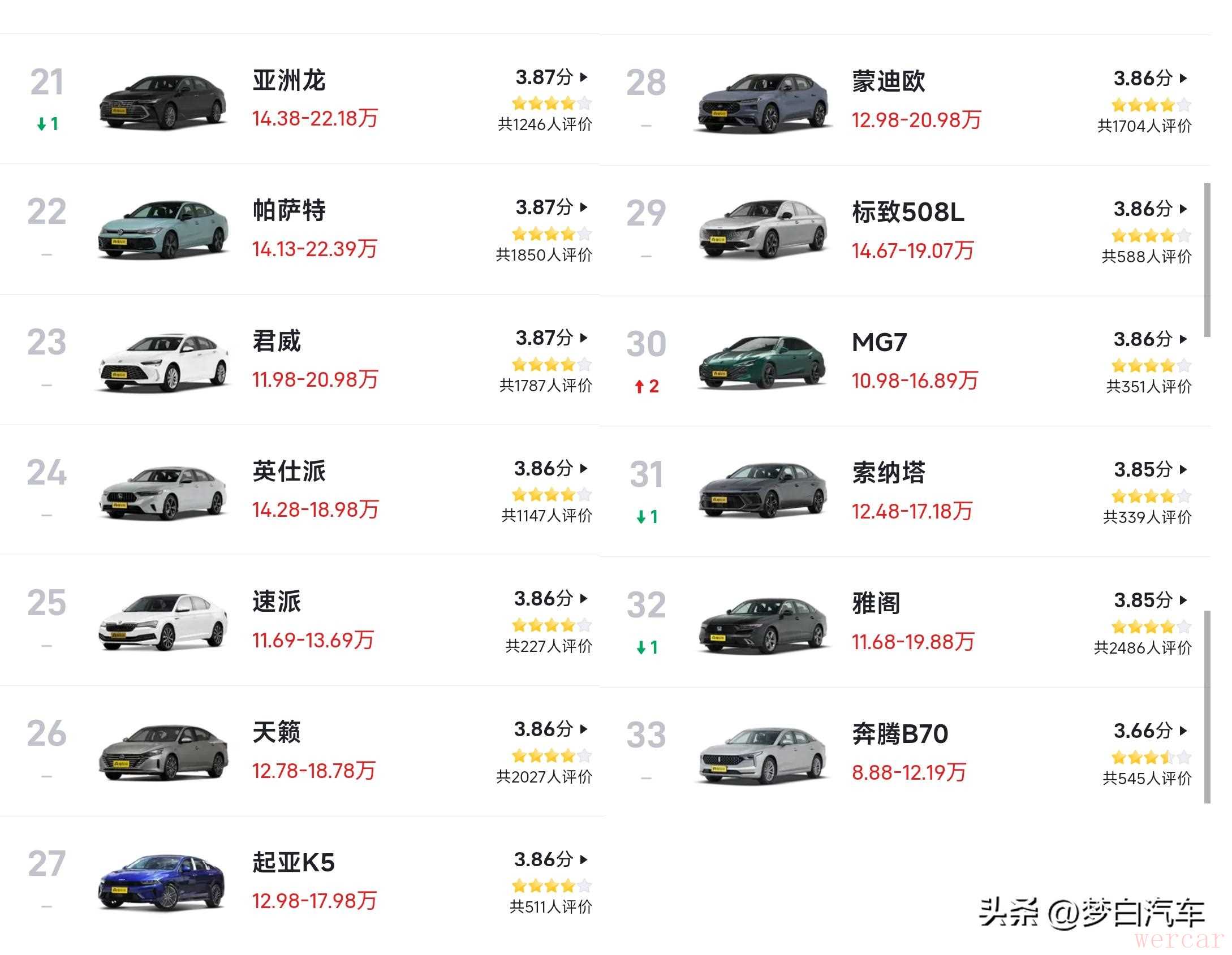 最后,亚洲龙、帕萨特、君威、英仕派、天籁和雅阁等主流B级车,口碑评分都未能入榜前20位,亚洲龙和帕萨特的口碑评分同为3.87分,而本田雅阁仅排名32位,不过它的口碑评分也达到了3.85分,排名第20位的大众迈腾相比,口碑评分差距也不大。