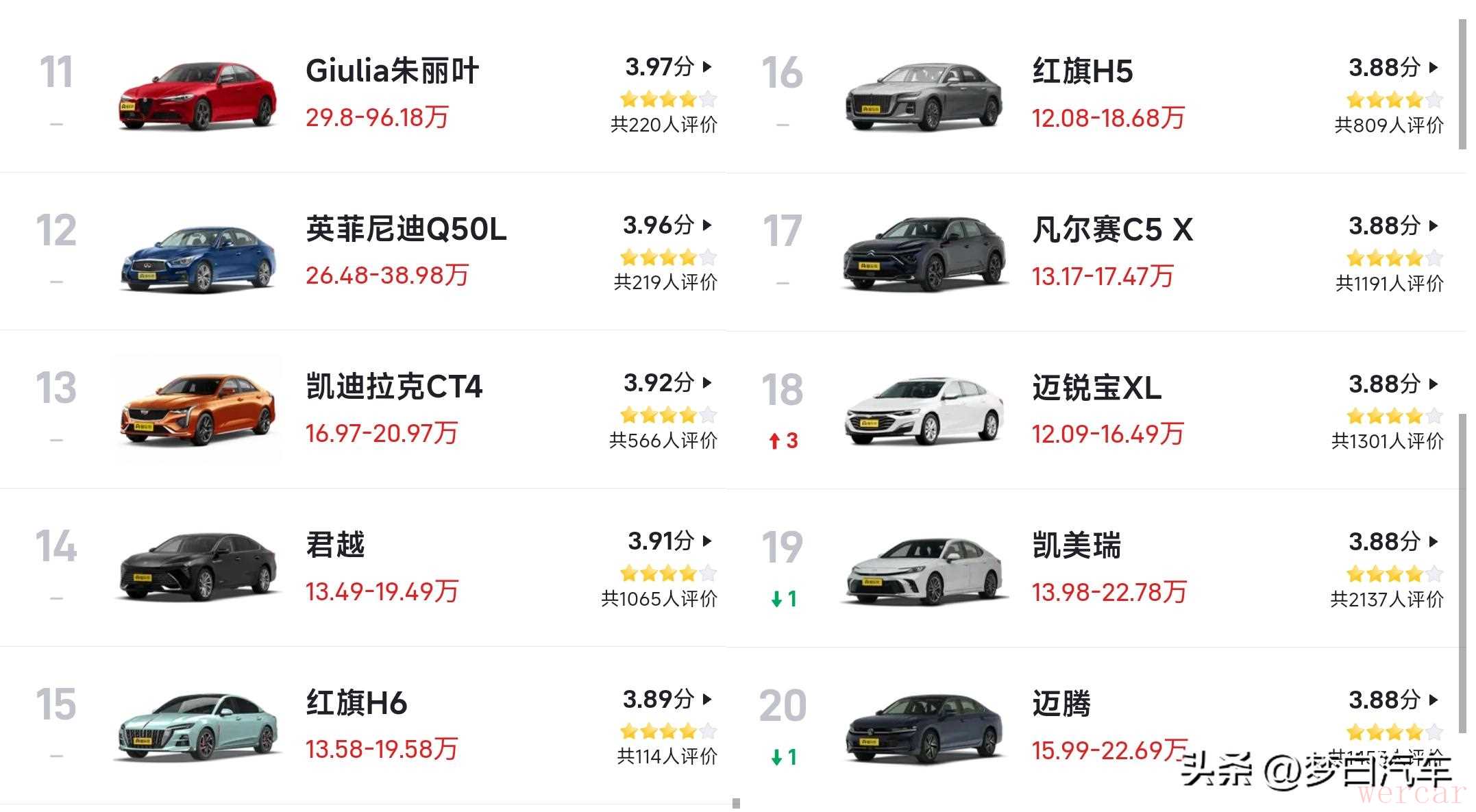 英菲尼迪Q50L、凯迪拉克CT4、别克君越和哈弗H6入榜前十五名,别克君越的评分超过了3..9分,还是比较合乎情理的,虽然它的市场表现不如雅阁和帕萨特等主流B级车,但在品控方面却并不比它们差,而且在品质方面反而要稍稍领先一些。国产车红旗H5排名16位,口碑评分也比较靠前,而凡尔赛C5 X和雪佛兰迈锐宝XL也都是叫好不叫座的B级车。丰田凯美瑞和大众迈腾入榜前20位,口碑评分同为3.88分,整体表现还是比较令人满意。
