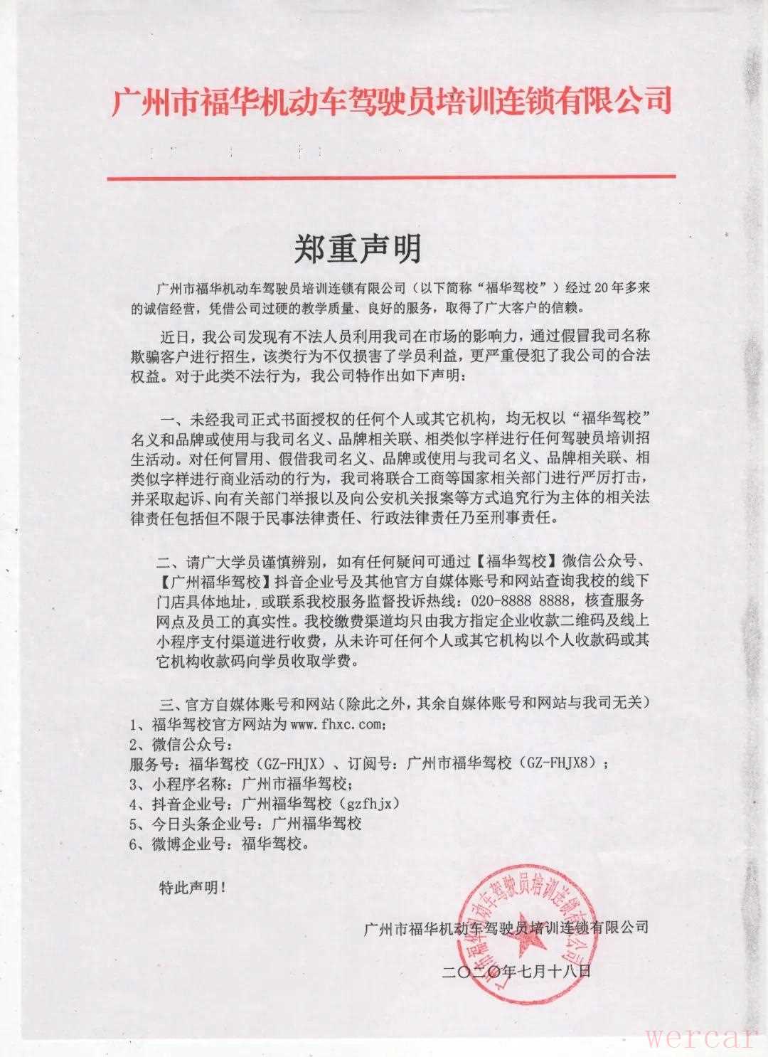 本「福华驾校」(以下简称“本驾校”)现就相关事宜,向全体学员、社会各界及广大家长郑重声明如下: