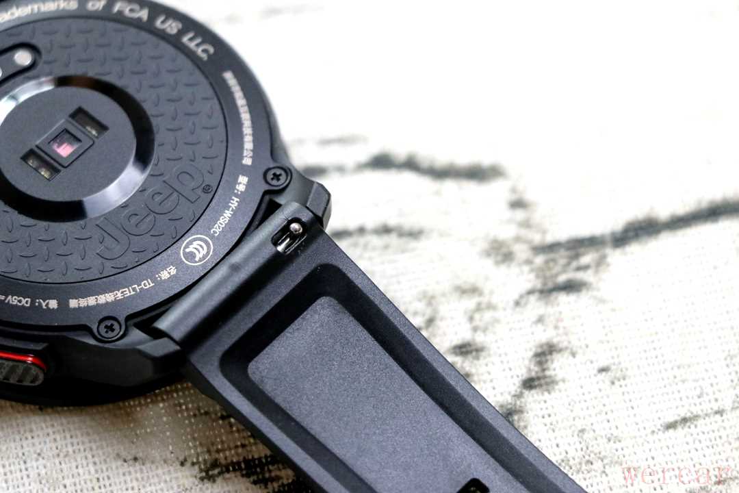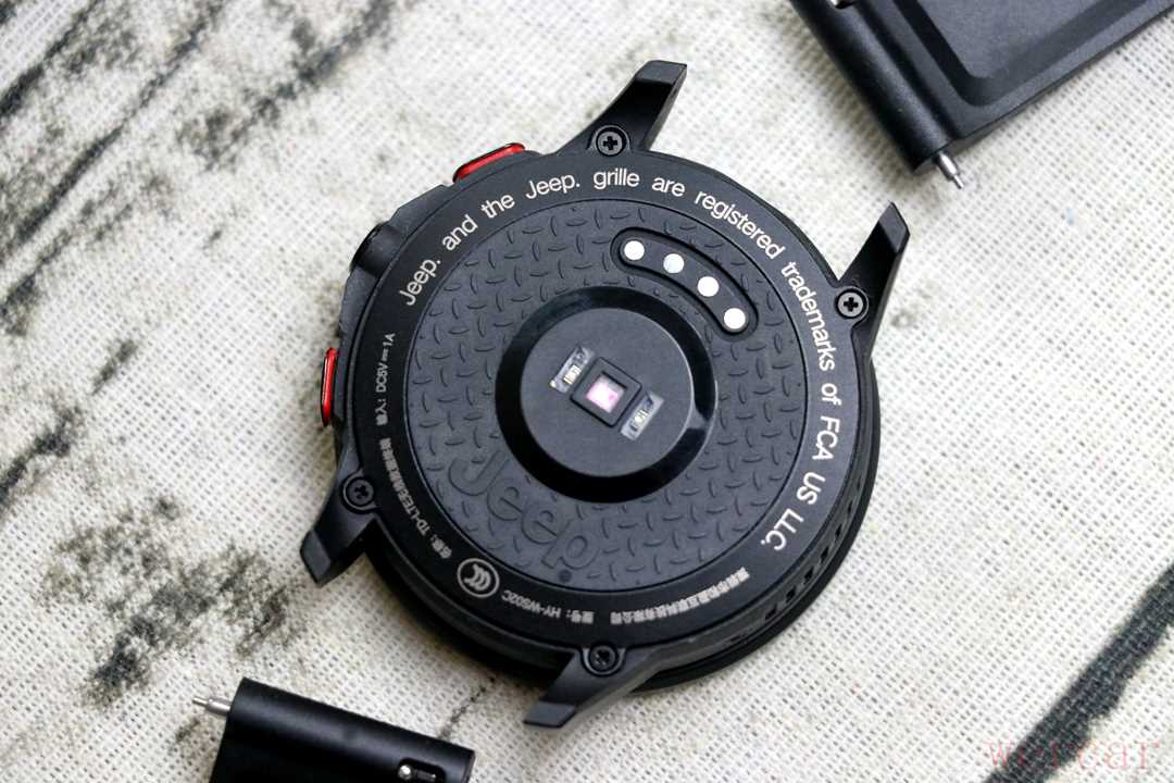 机身背面的设计并不复杂,采用4个充电触点和一个腕式心率传感器进行充电和监测心率。