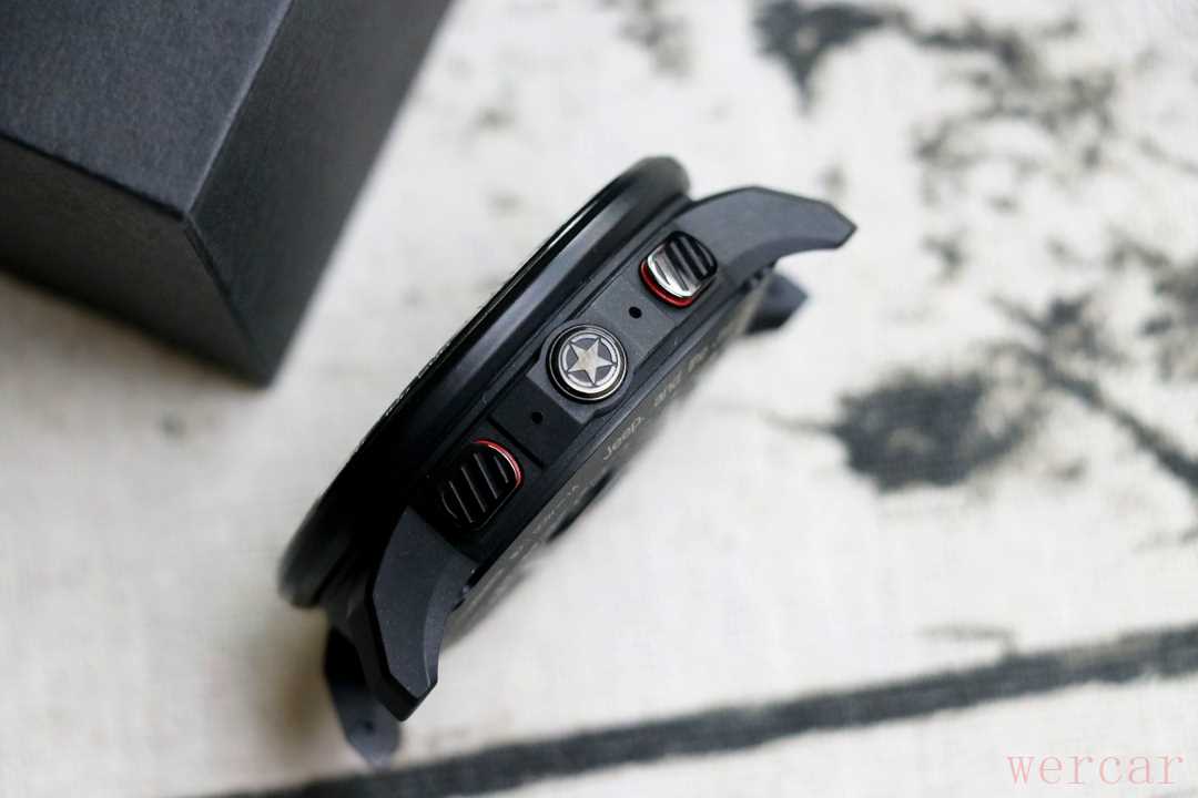 刻度盘的右侧是主要的操作区域。从上到下有三个按钮,分别是返回按钮、电源按钮和快捷按钮。在返回按钮和电源按钮之间还有一个麦克风孔。值得一提的是,动力按钮上还标着一颗同盟星,这是Jeep非常经典的元素。从实际操作逻辑来看,只有三个按钮是不够操作的。因此,Jeep Global Watch配备了触摸屏,下面将对此进行详细介绍。