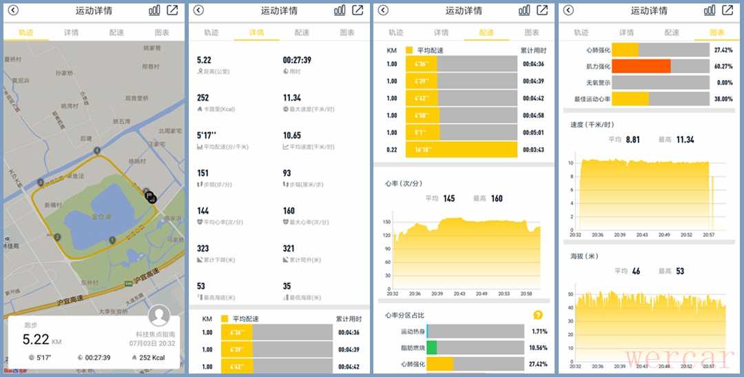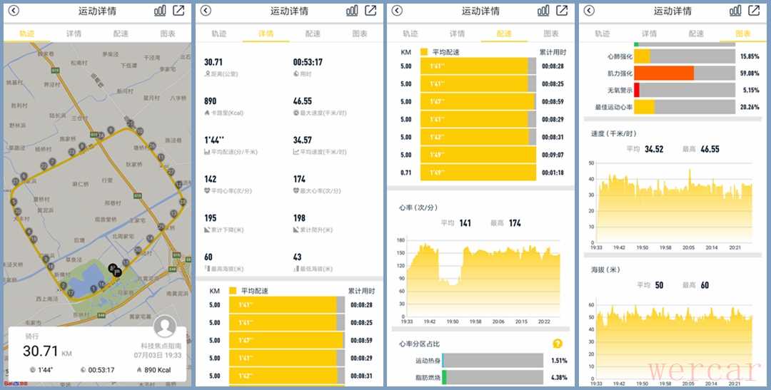 自行车数据也很相似,它也会显示距离、路径、速度、心率、爬升高度和海拔高度等,但速度是以5公里为基础的。
