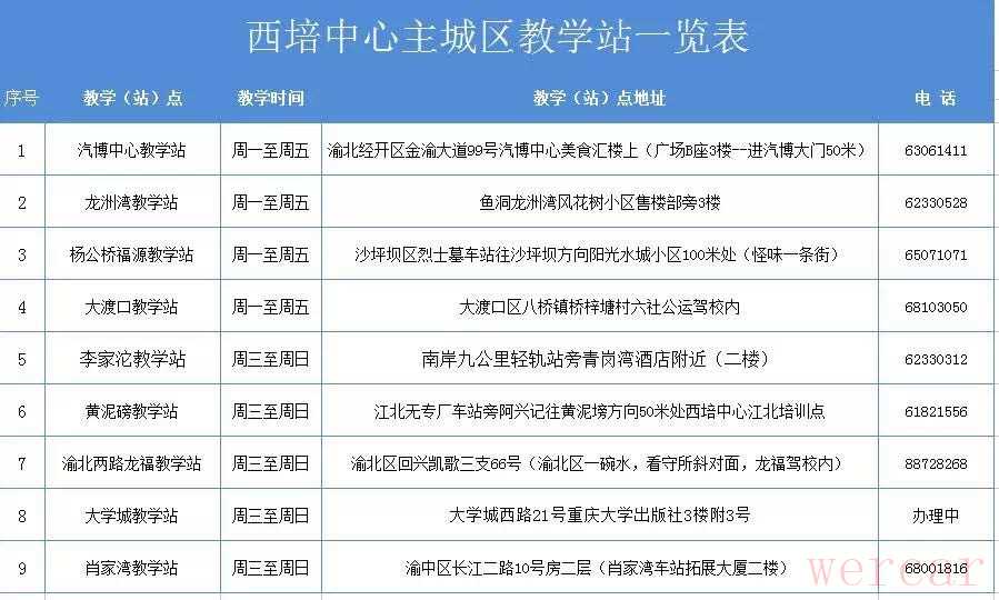 李家沱教学站、黄泥磅教学站、渝北两路龙福教学站、大学城教学站、肖家湾教学站,以上五个教学点的上课时间是周三至周日。